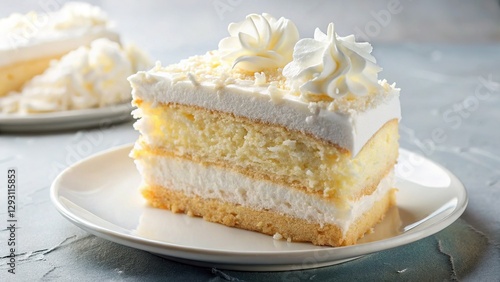 Luxurious Coconut Cream Cake Slice on Elegant White Plate - Stock Photo