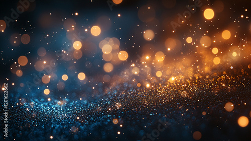 Luxurious dark blue glittery backdrop with golden bokeh lights creating depth.