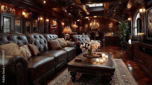 Luxurious, dark-toned living room with rich wooden details, leather furniture, and warm lighting. A spacious room, elegantly decorated with a focus on comfort and sophisticated design