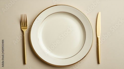 Luxurious dining arrangement showcasing a white plate bordered in gold, complemented by a golden knife and fork on a soft beige background