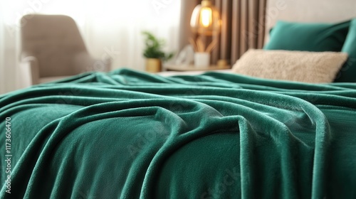 Luxurious emerald green velvet bedspread in elegant bedroom decor setting.
