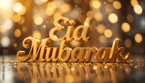 Luxurious Golden Eid Mubarak Greeting with Sparkling 3D Text and a Warm Bokeh Light Background – Elegant and Festive Islamic Celebration Design
