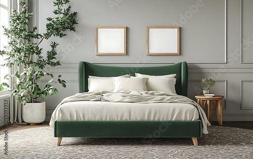 Luxurious green velvet bed in modern bedroom interior