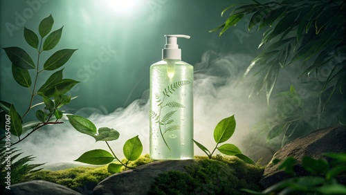 Luxurious Herbal Shampoo Bottle in Misty Green Forest Setting