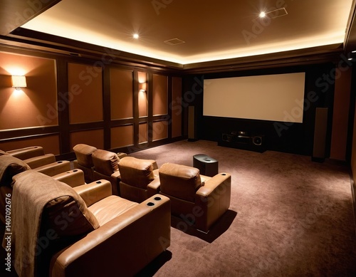 Luxurious home theater with leather recliners and a large screen for ultimate cinematic experience.