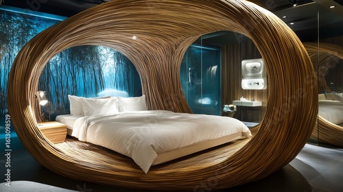 Luxurious hotel room features a unique wooden bed frame and a scenic backdrop