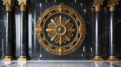 Luxurious interior design featuring a grand gold ornamental medallion on black marble columns with elegant white veining, combining classical architecture with royal opulence and symmetry