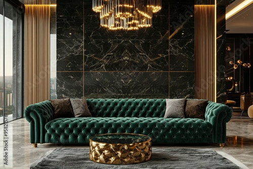 Luxurious Living Room with Green Velvet Sofa and Gold Accents