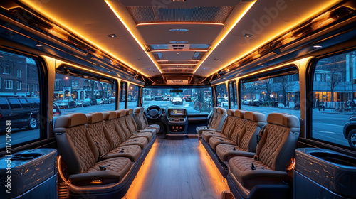 Luxurious minibus interior with leather seats and ambient lighting.