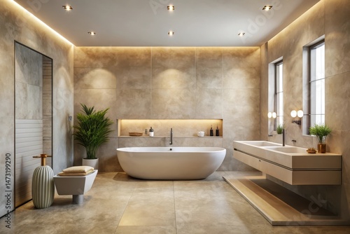Luxurious Modern Bathroom Design with Freestanding Tub and Floating Vanity Featuring Subtle Lighting and Earthy Tones