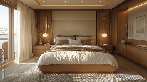 Luxurious modern bedroom with large windows overlooking the water during the golden hour