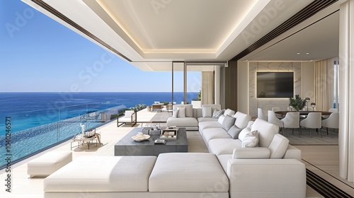 Luxurious modern terrace overlooking the tranquil blue ocean with comfortable seating and dining area under a stylish roof design capturing serenity
