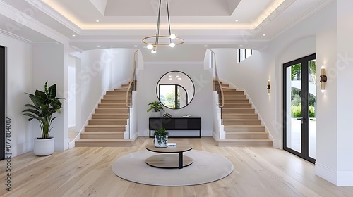 luxurious modern villa interior, entryway with arched doorway and double stairs in the background, light oak wood floors, cream walls, white ceiling, large mirror on the wall above a console table,