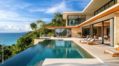 Luxurious modern villa with infinity pool overlooking lush green tropical landscape and ocean view, outdoor terrace with sun loungers and contemporary architecture