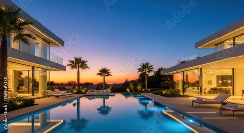 Luxurious Modern Villas with Infinity Pool Reflecting a Vibrant Sunset Sky.