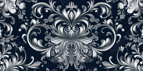 Luxurious navy blue and silver festive pattern with delicate ornaments.