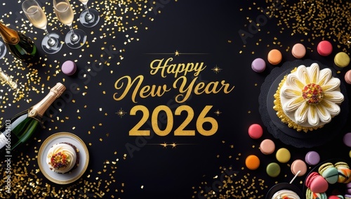 Luxurious New Year’s Eve Flat Lay with Champagne, Cake, and Golden Confetti
