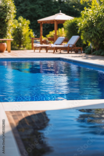 Luxurious outdoor swimming pool with loungers in sunny garden retreat setting