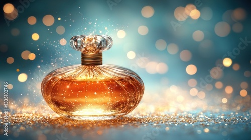 Luxurious perfume bottle on a glittering surface