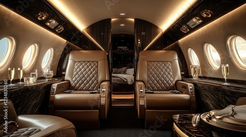 Luxurious private jet interior featuring plush leather seating and spacious design details