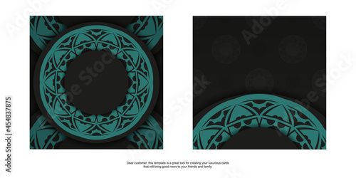 Luxurious Ready-to-print postcard design in black with blue ornaments. Invitation template with space for your text and abstract patterns.