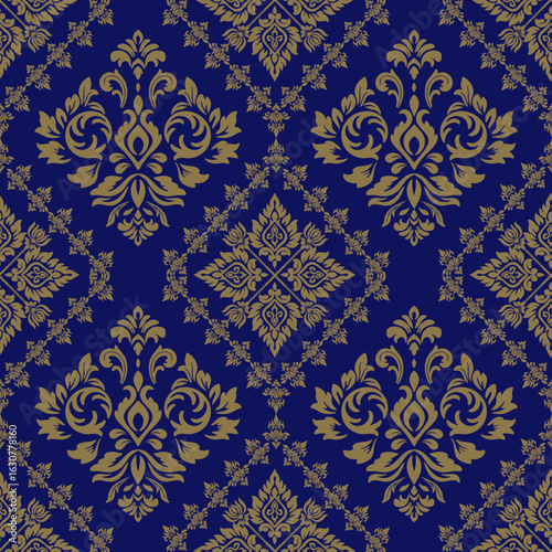 Luxurious seamless Damask pattern featuring intricate golden floral and ornamental motifs on a deep navy blue background. Ideal for fabric design, wallpaper, packaging, invitations.