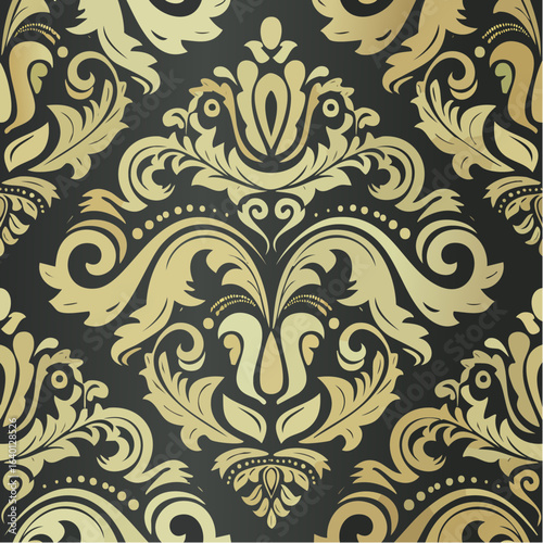 luxurious seamless gilded damask brocade fabric pattern in gold on matte black with embossed elegance