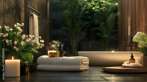 Luxurious spa bathroom with bathtub, candles, and plants.