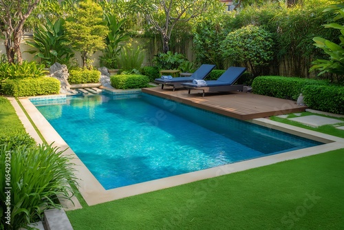 Luxurious tropical backyard oasis with sparkling swimming pool