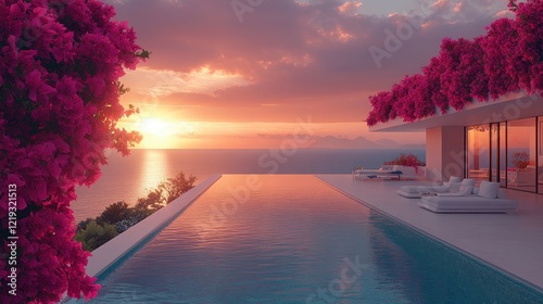 Luxurious villa overlooking the ocean at sunset with vibrant flowers in bloom