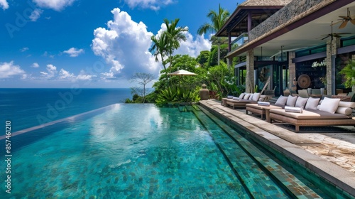 Luxurious villa with a sprawling infinity pool overlooking the ocean, surrounded by lush tropical gardens and elegant outdoor seating areas