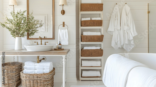 Luxurious white bathroom interior design; towels, bathrobes, and bathtub. Perfect for home decor or real estate websites