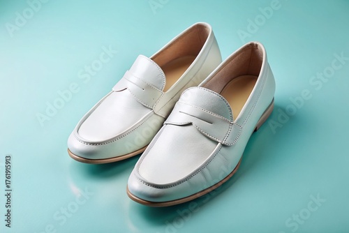Luxurious White Leather Loafers: Panoramic View on Light Blue Background
