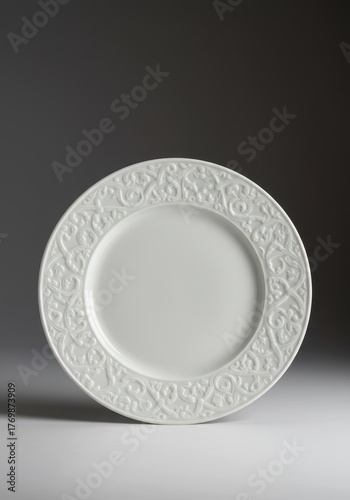 Luxurious white porcelain dinner plate featuring intricate, raised ornate patterns, centered against a clean, simple, isolated plain background ,Plate ,tableware ,porcelain