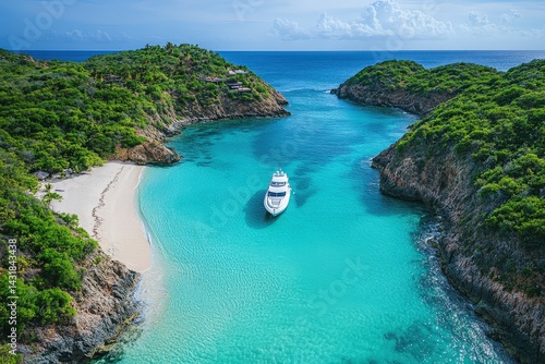 Luxurious yacht anchored in a secluded tropical cove surrounded by lush greenery and crystal-clear waters