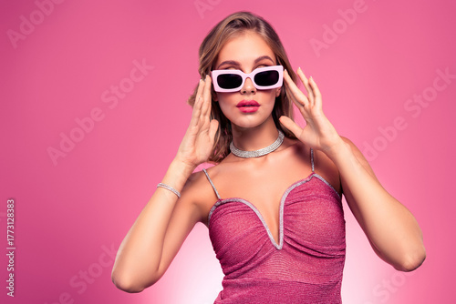 Luxurious young woman in pink sunglasses and glamorous dress posing against vibrant background with stylish expression