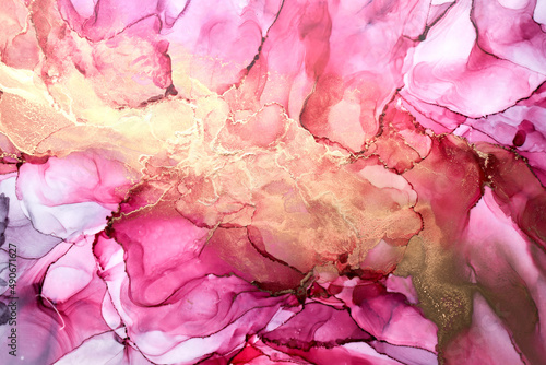 Luxury abstract background in alcohol ink technique, pink gold liquid painting, scattered acrylic blobs and swirling stains, printed materials