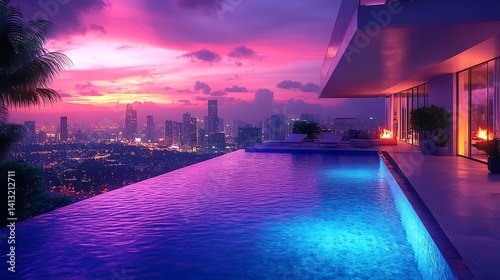 Luxury Apartment Infinity Pool Overlooking City Skyline At Sunset Photo
