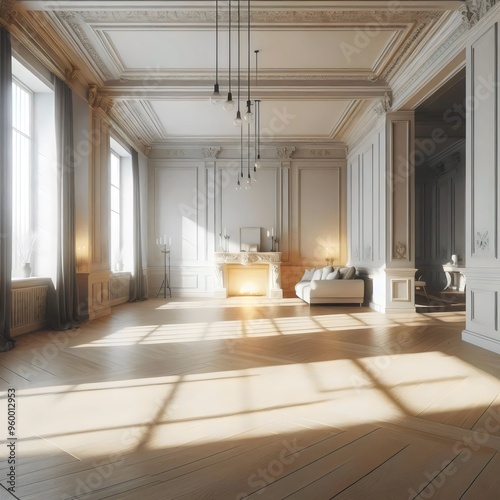 Luxury apartment with living room. Large bright room with high ceilings, windows and fireplace. 3D illustration.