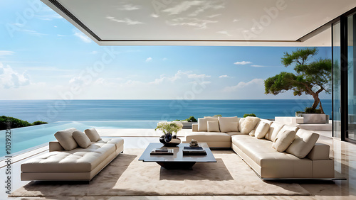 Luxury architecture, ocean front property landscape. Modern living room interior design with sleek contemporary designer furniture, minimalist decor large windows, panoramic coastal view background.