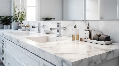 luxury bathroom interior with white marble countertop and golden sink.generative ai