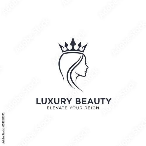 Luxury beauty logo design featuring a womans face with a crown isolated on white background for branding