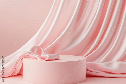 Luxury beauty product podium stage with silk fabric on pink background. Premium brand showcase mockup template. Studio stage scene display. Soft and creamy pastel aesthetic, ai