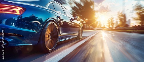 Luxury blue business sedan speeding on the highway with sunlight background. Generative ai