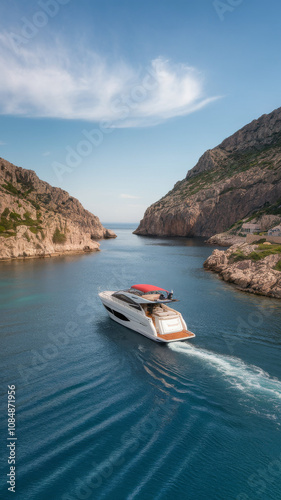 Luxury boat in a stunning sea canyon. Outdoor lifestyle summer photography wallpaper with lakes and mountains.