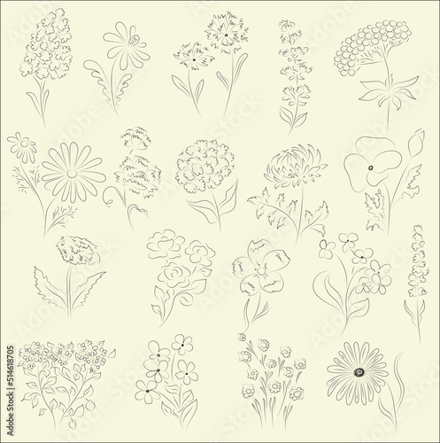 Luxury botanical set with wildflowers and minimalist flowers for wall decoration, cosmetic, wedding. Hand drawn line herb, elegant leaves for invitation save the date card. Botanical rustic