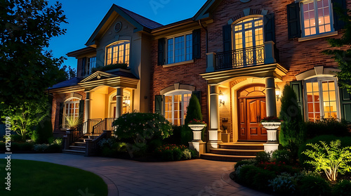 Luxury Brick House Exterior at Night with Beautiful Landscaping and Warm Lighting. Real Estate Photography