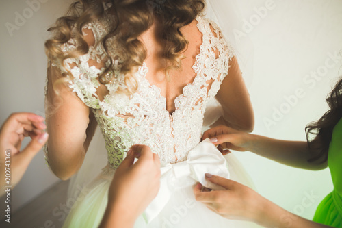 Luxury bride in white dress posing while preparing for the wedding ceremony
