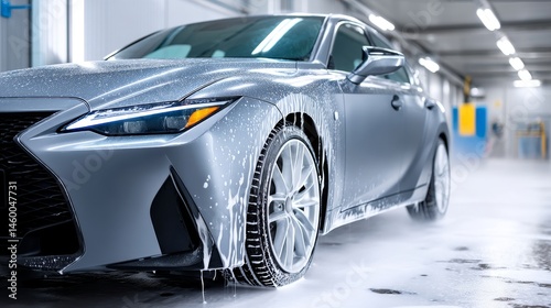 Luxury Car Wash Service - Gleaming silver car undergoing a professional car wash, covered in soapy foam
