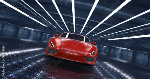 Luxury concept sports car 3d model in a showroom. Reflections all around.